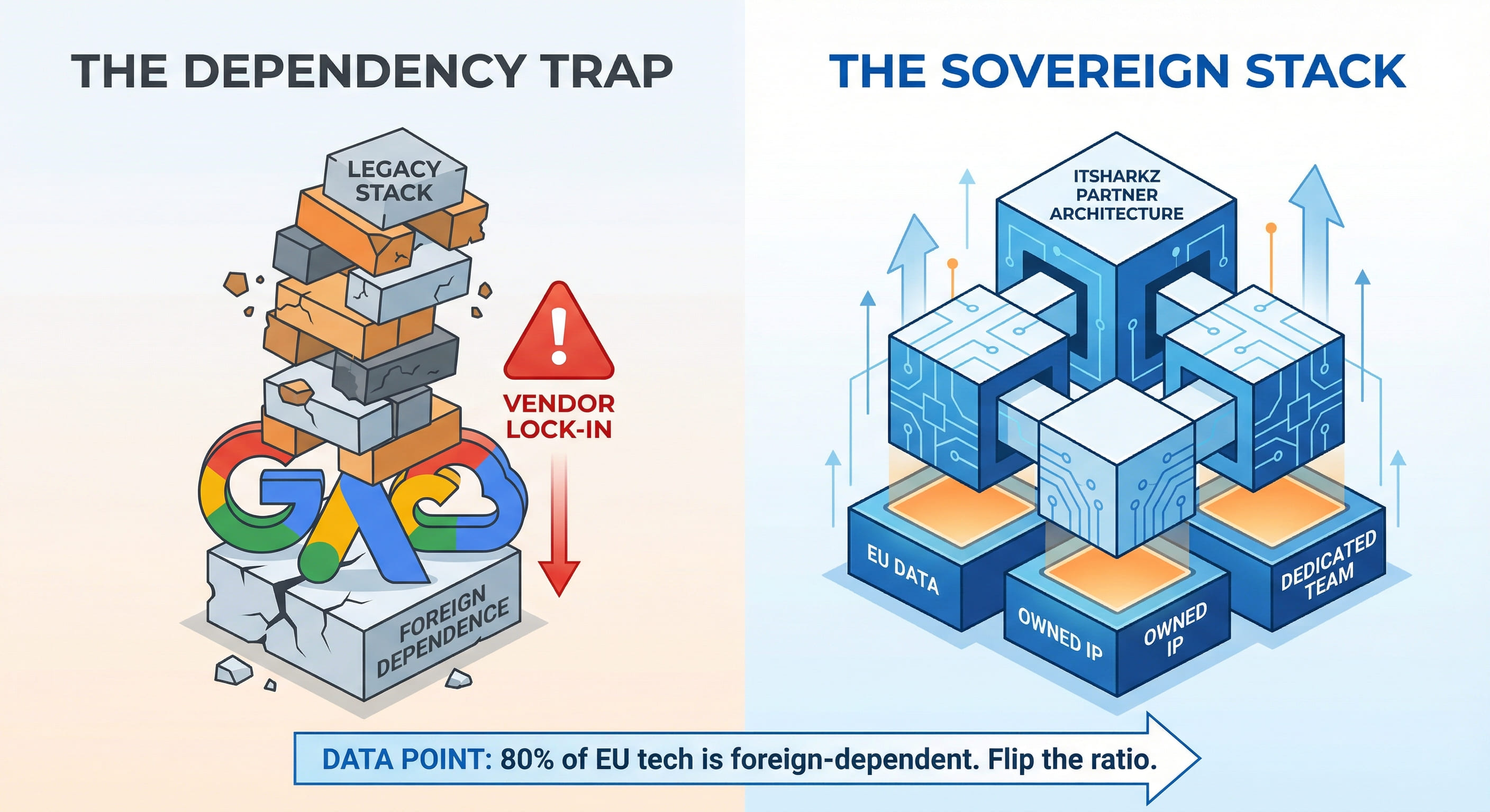 Currently, Europe relies on non-EU countries for over 80% of its digital infrastructure. For a scale-up, this is a massive strategic vulnerability. Unlike physical goods, digital services are ongoing relationships. If a provider in Silicon Valley changes their algorithm, pricing model, or access terms, your market access changes instantly, without negotiation.