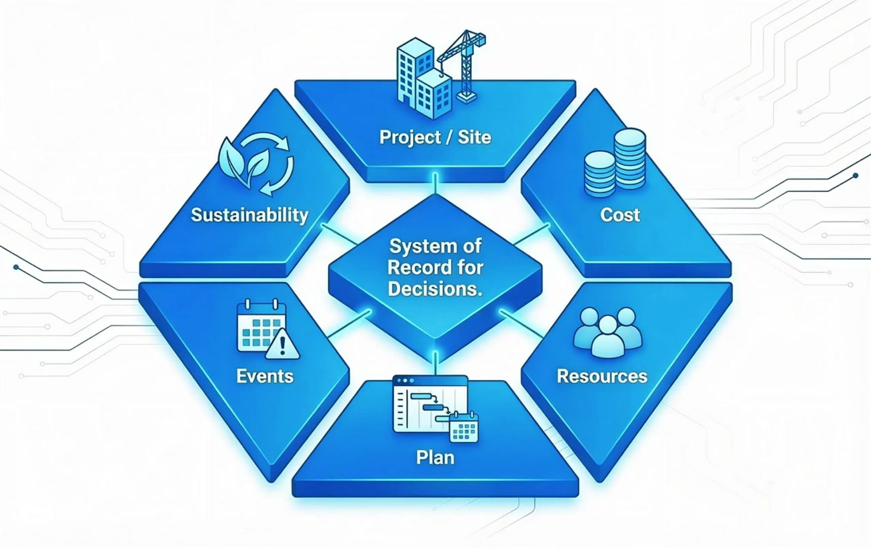 Forget the paralyzing goal of “integrating everything.” Start with a model that matches how the business actually thinks. By aligning six key dimensions – Project/Site, Cost, Resources, Plan, Events, and Sustainability – you build a “system of record for decisions.”